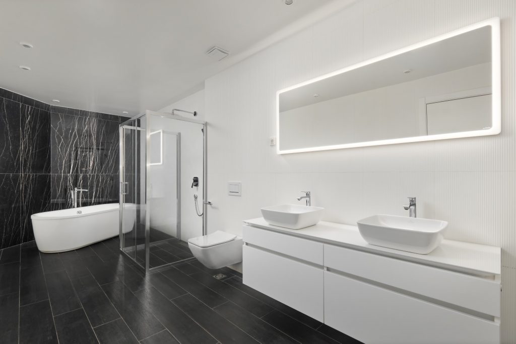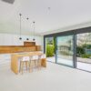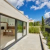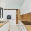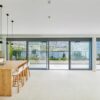 Premium materials are used throughout, including a Nobilia/Bosch kitchen, Villeroy & Boch, Catalano, and Hansgrohe bathroom fittings, and finishes by Florim, Porcelanosa, and natural stone. Underfloor heating is installed in living areas and bathrooms, with recessed air conditioning and ventilation integrated into the ceilings.