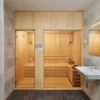 The first floor features a glass-enclosed entrance leading to a central deck and infinity pool. To the left is a high-ceiling living area with a wood-burning stove and open kitchen, while to the right is a master suite with en-suite bathroom and pool access, an additional double bedroom or flex space, bathroom with sauna, and guest toilet.