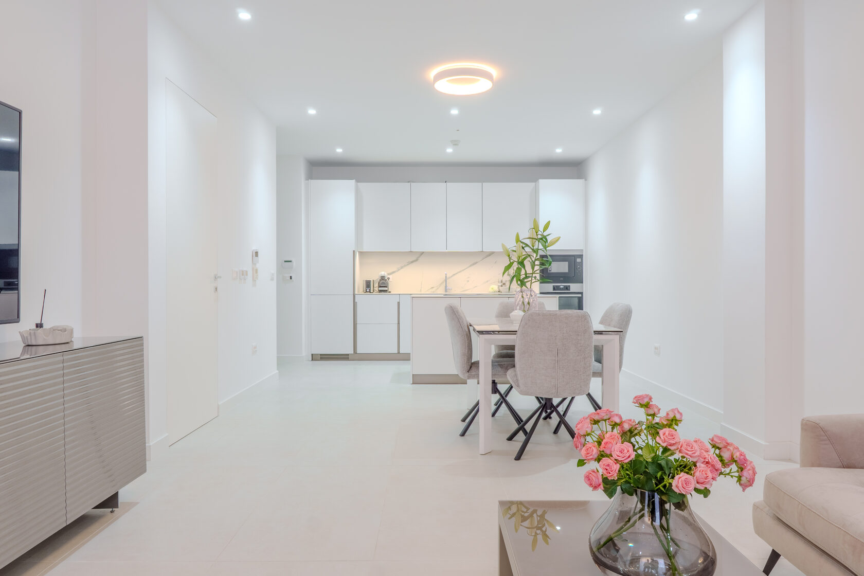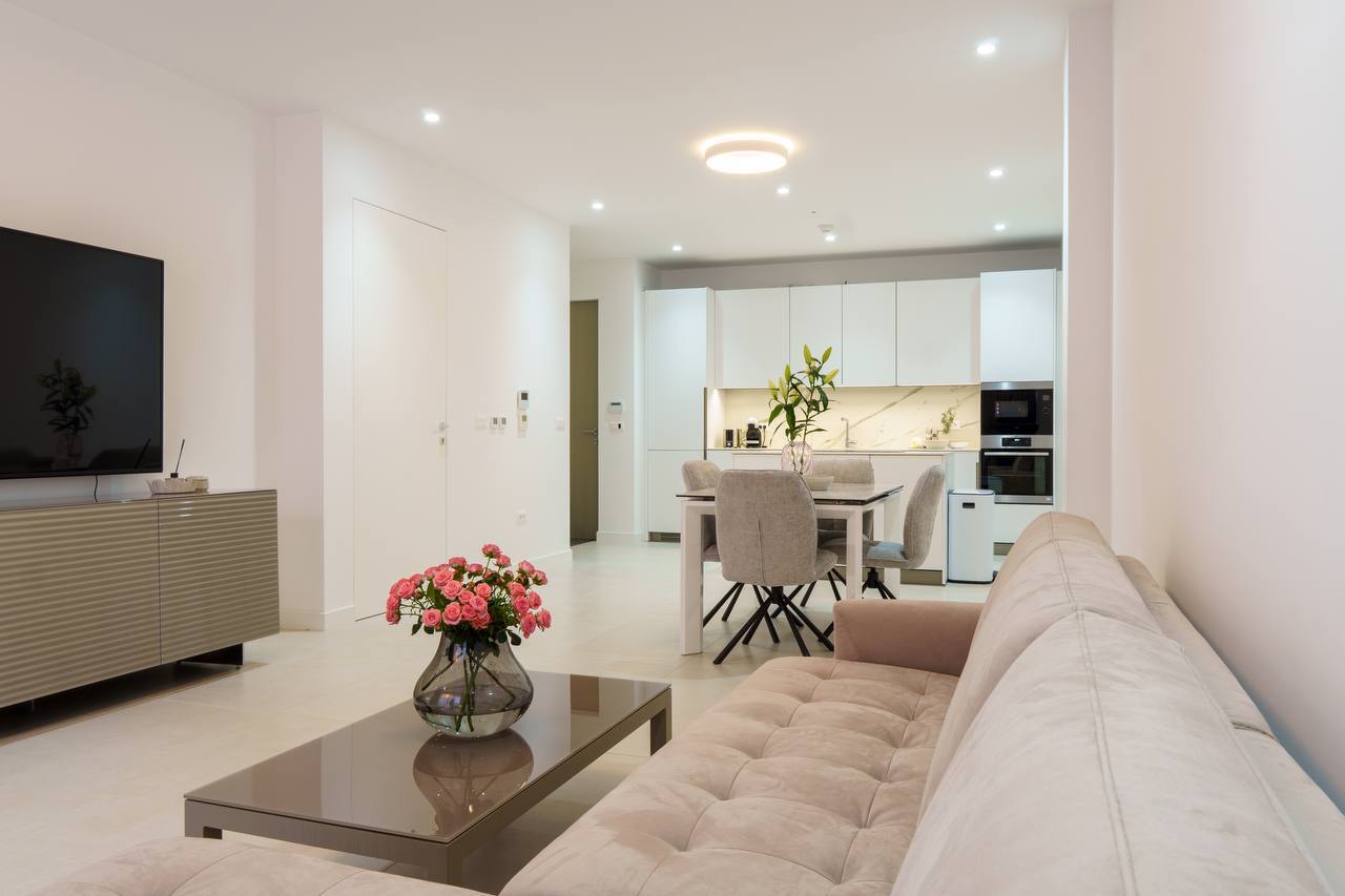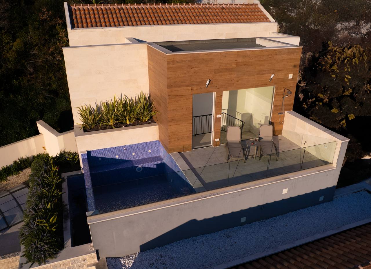 Each home features bright open-plan interiors, private terraces or gardens, optional pools, and panoramic views of the Bay of Tivat. Premium finishes include Italian kitchens, oak parquet with underfloor heating, smart-home systems, and high-end fixtures.