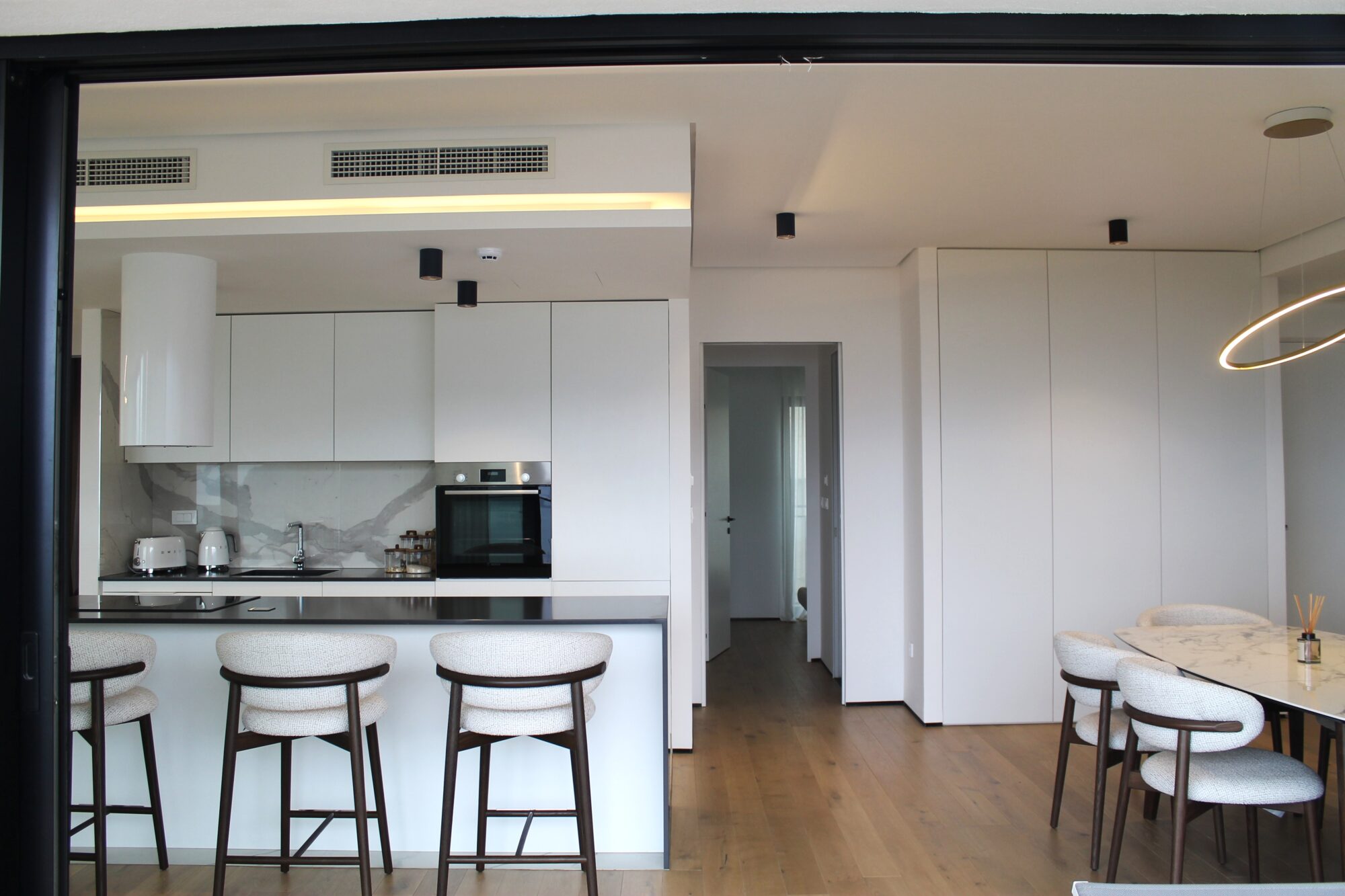 Finished with quality natural materials like stone and wood, the apartment is fully furnished and air-conditioned throughout. Bathrooms feature Grohe and Idevit fixtures, while elegant parquet flooring adds warmth and style.