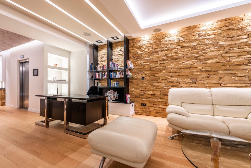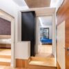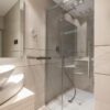 The bathroom includes a spa bath and toilet, while custom-designed wardrobes and branded furniture elevate the bedroom spaces. Two terraces on opposite sides of the building provide natural light and outdoor relaxation.
