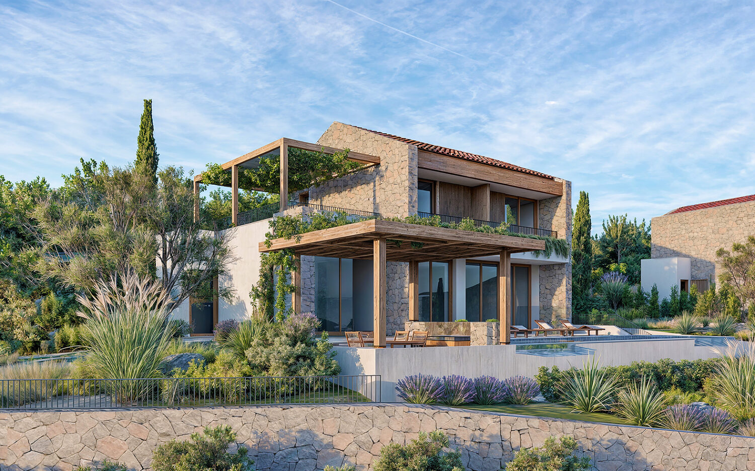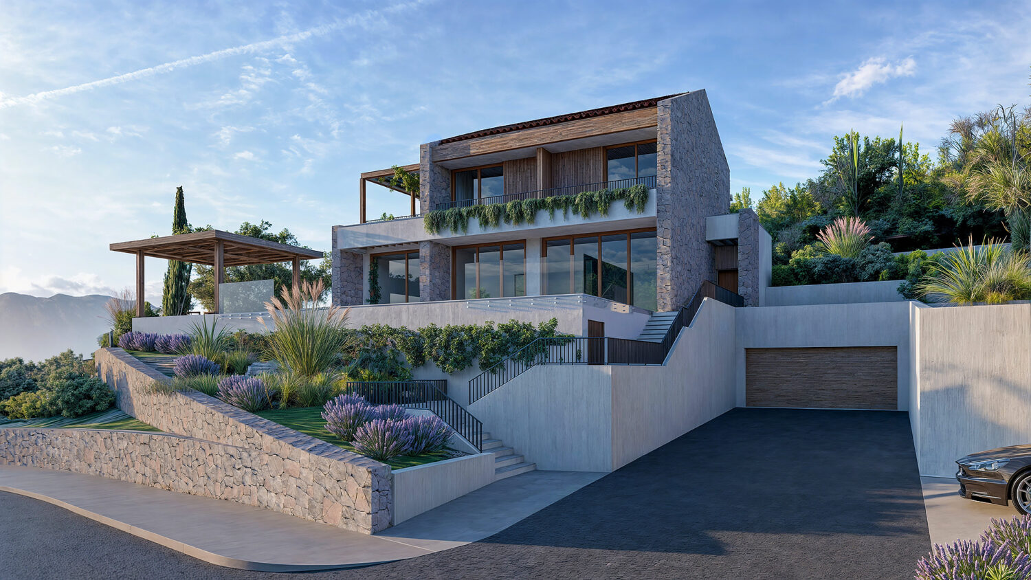 The ground floor offers 124 m² of interior living space, complemented by an 11 m² terrace and a 35 m² garage. The first floor adds 66 m² of internal space and a generous 44 m² terrace, providing panoramic views and seamless access to the outdoors.