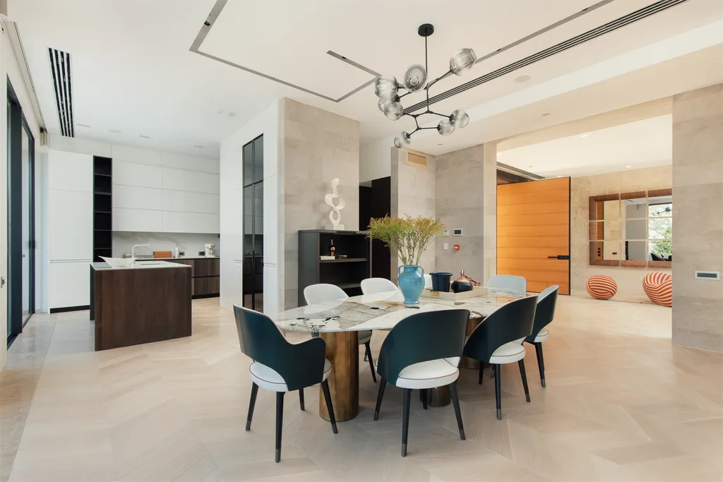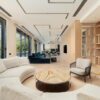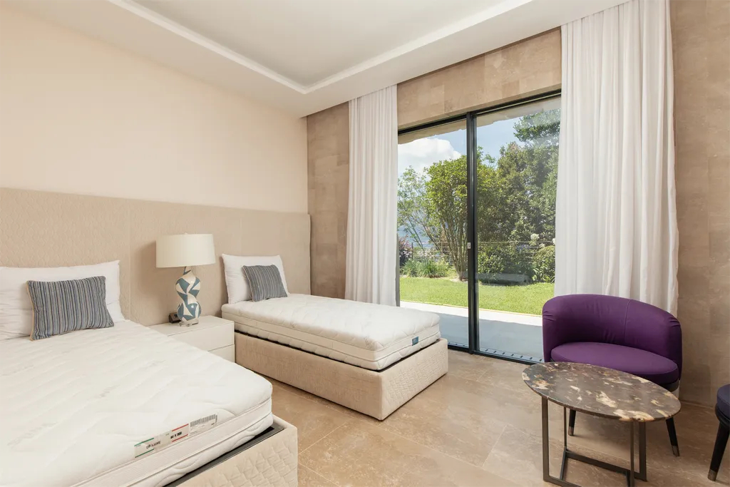 Spanning 526 m² with 330 m² of terraces and yard, the villa features a 20-meter private beach and a berth for yachts up to 25 meters. It offers four bedrooms, five bathrooms, six parking spaces, and a 70 m² outdoor pool.