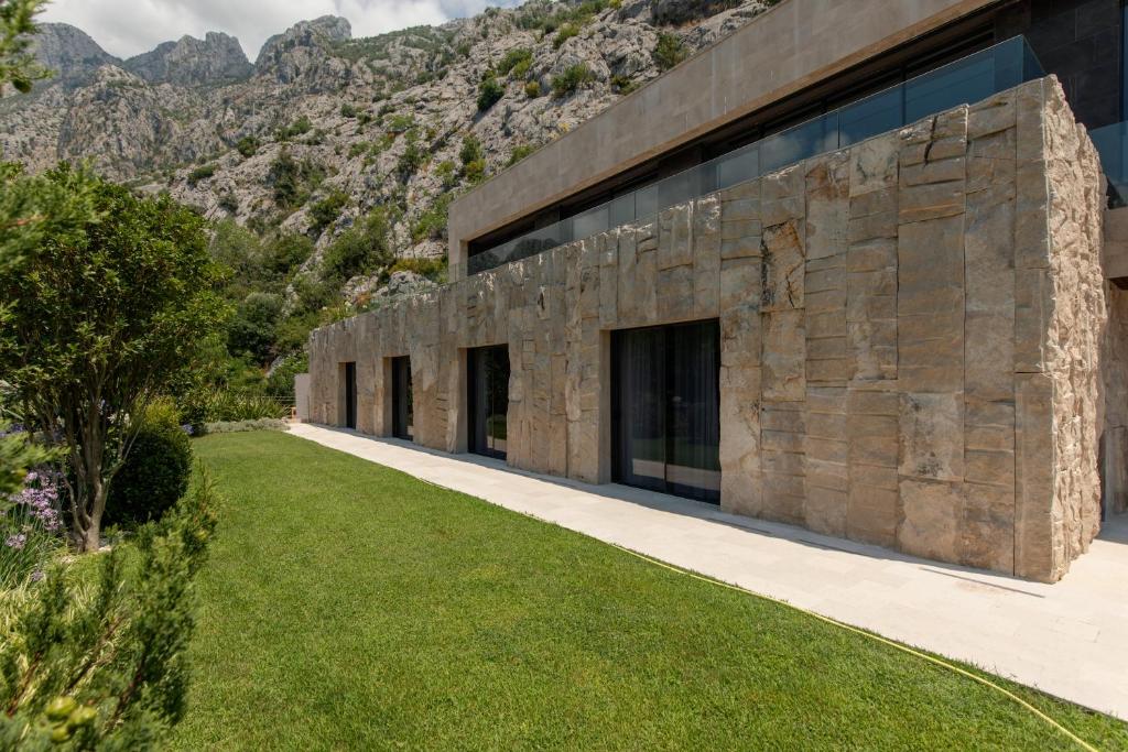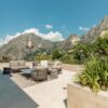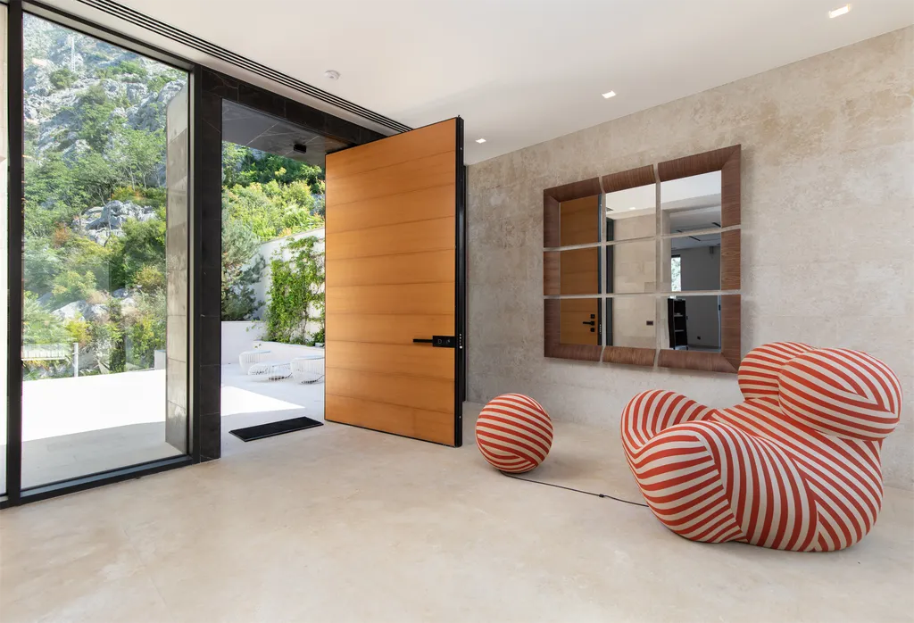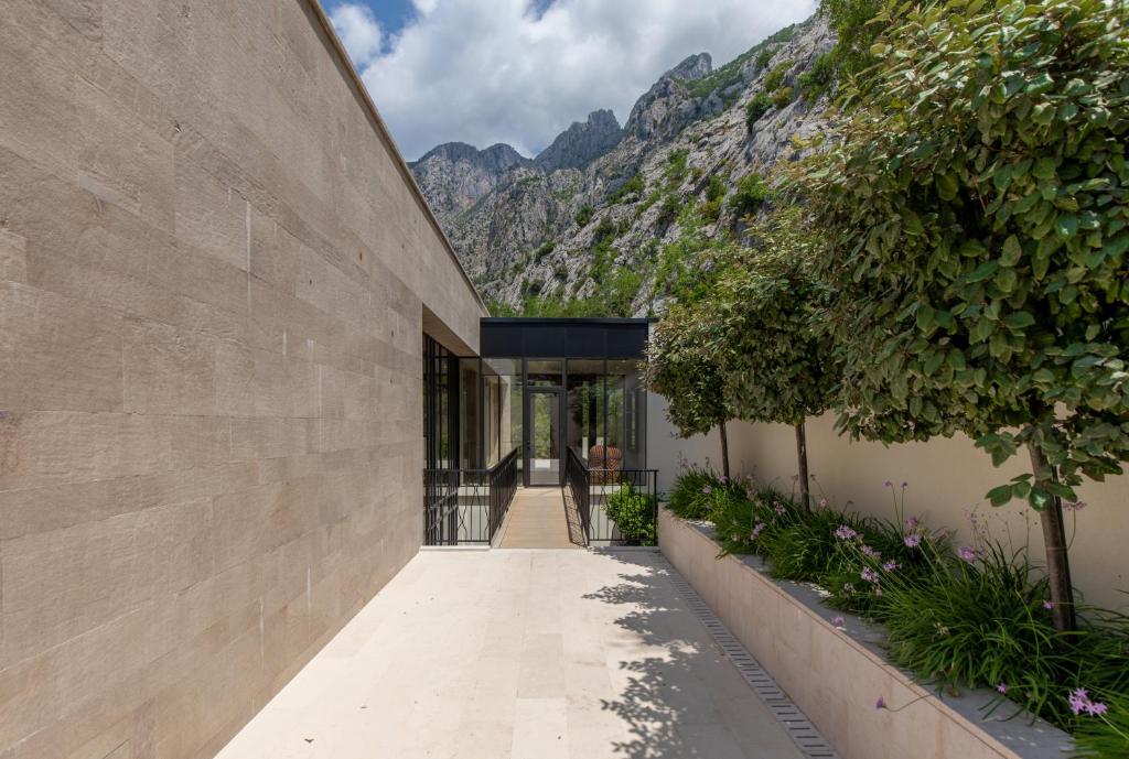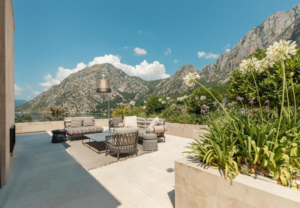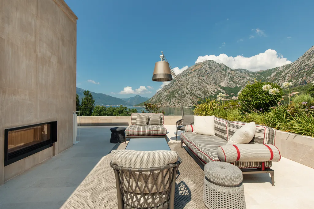 Outdoor amenities include split-level courtyard terraces with designer lounge areas, an outdoor fireplace, custom lighting, and parking for up to six vehicles. Located just 9 km from Kotor and 15 km from Tivat Airport, this villa offers rare seafront living with direct sea access—perfect for serene retreats or elegant entertaining.