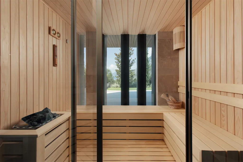 The fully furnished two-level home includes four en-suite bedrooms, a private spa, gym, laundry, and technical room on the first floor, alongside a garage with two indoor parking spaces. The second floor boasts a spacious living room with a fireplace, a fully equipped kitchen and dining area, a guest bathroom, and a terrace with stunning sea views.
